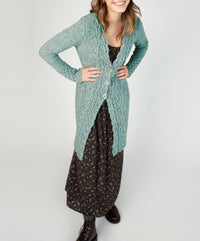 As part of our Archive Collection the 'Horseshoe' cable coat is a classic v neck, long shaped slim fitting cardigan, consisting of a soft horseshoe cable pattern with trellis stitch detailing on the sleeves, its shape is both flattering and comfortable. It has large seashell buttons that add feminine detailing.