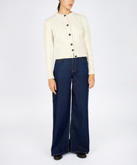 Als Teil der Embers-Kollektion verbindet der kurze Aran-Cardigan „Elva“ traditionelle Aran-Maschen mit einer verspielten, modernen Silhouette. Natur ist die ursprüngliche helle Cremefarbe für Arans, allgemein bekannt als „Báinín“ oder „Weiß“. Dieses Modell aus 100 % Merinowolle ist ein kurzer Cardigan mit 6 Knöpfen, schmalen Ärmeln und einem hohen 1x1-Rippbund für eine schmeichelhafte Silhouette.
