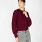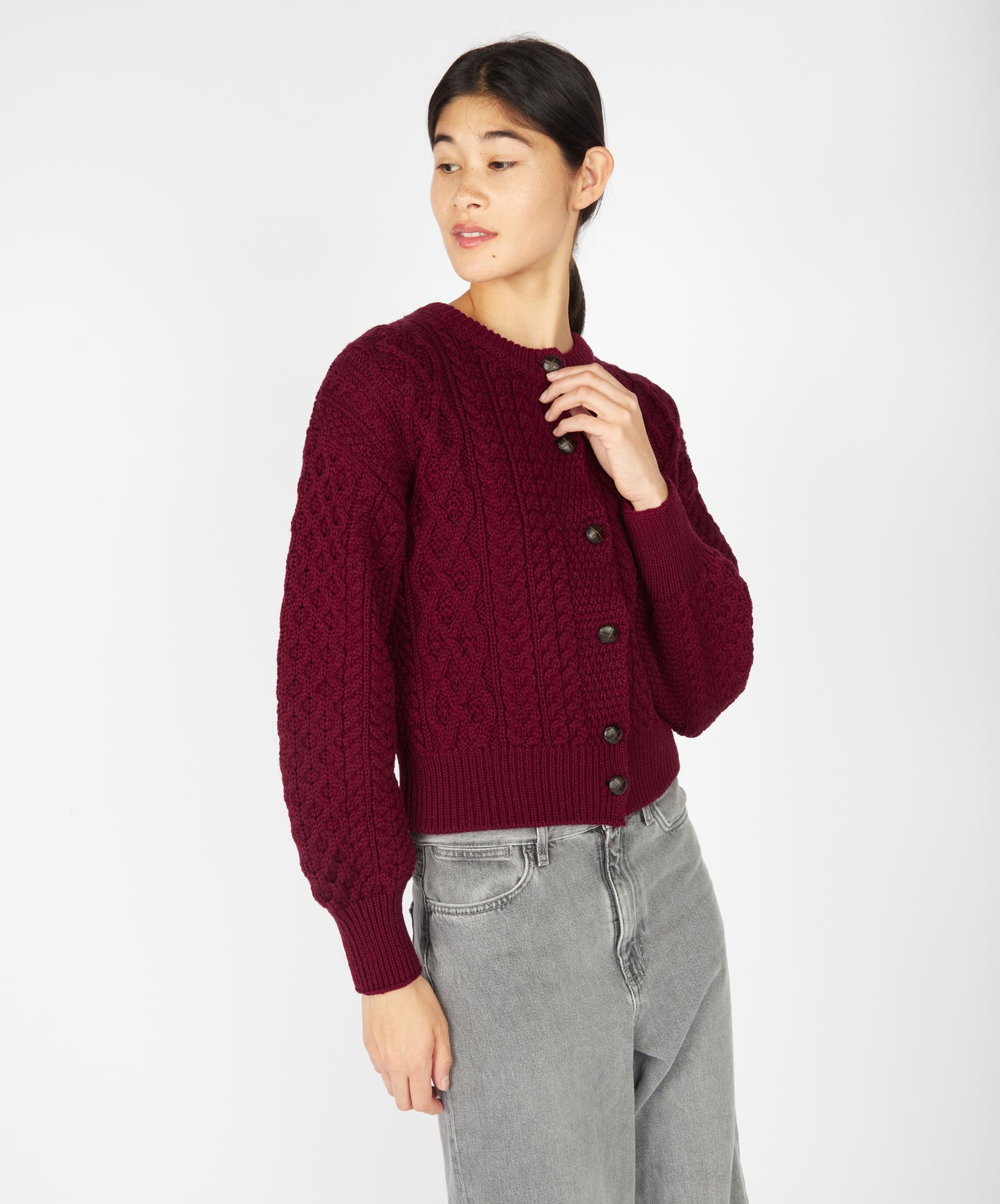 This style is finished in a dark, rich red that adds depth while remaining versatile. Its cropped silhouette is balanced with generous lantern sleeves, and the combination of moss, honeycomb and cable stitches reflects classic Aran heritage.