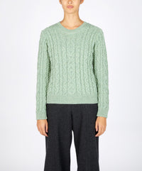 As part of the Embers Collection, The 'Dana' cable crew neck uses traditional Aran stitches with a classic silhouette. Sage marl is a soft pastel two tone marl colour made up of delicate and darker sage green yarns. This 100% Merino wool style is a cropped crew neck with slim fitting sleeves and all over cable patterns with honeycomb and basketweave to create a timeless piece. Size up if you prefer a slouchier fit.