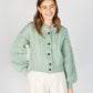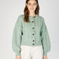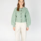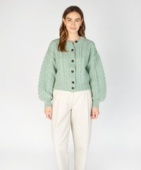 The two-tone marl of vibrant and warm yellow yarns brings a bright, uplifting finish. The cropped silhouette is balanced with generous lantern sleeves, while moss, honeycomb and cable stitches add texture inspired by classic Aran design.