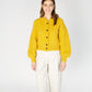 The two-tone marl of vibrant and warm yellow yarns brings a bright, uplifting finish. The cropped silhouette is balanced with generous lantern sleeves, while moss, honeycomb and cable stitches add texture inspired by classic Aran design.