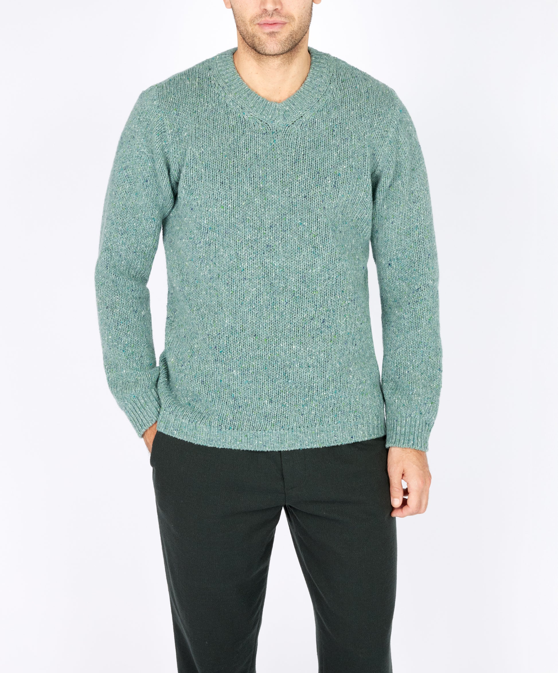 As part of our Heirlooms Collection, this chunky, jersey V-Neck sweater with the added softness of cashmere, our Kilbride V-Neck is a timeless classic. Ocean mist is a soft seagreen marl with navy, blue, grey, green and turquoise neps.