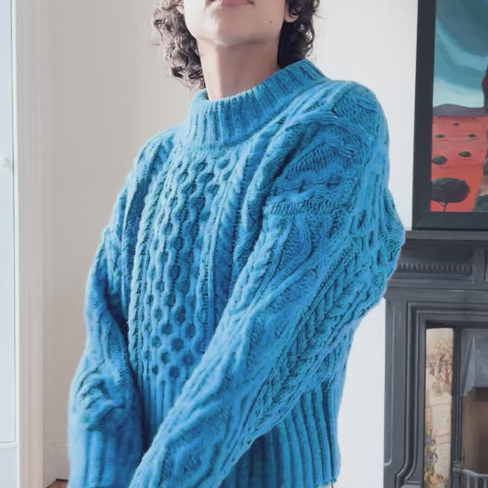 As part of the Archive Collection, the 'Liberty' crew neck takes the classic Aran sweater and gives it a fresh, playful and contemporary silhouette with chunky rib details combined with Honeycomb and traditional diamond stitch work. A vibrant blue with flecks or dark navy, royal blue and pastel blue. This piece is made from a blend of 95% wool, 5% cashmere for an even softer, more luxurious hand feel.