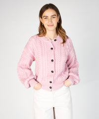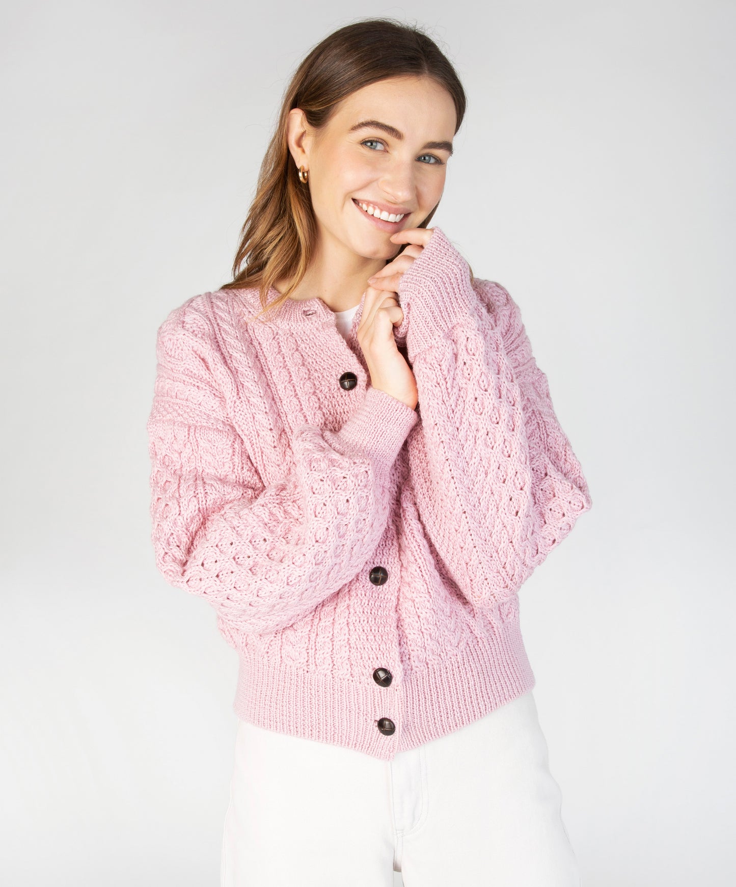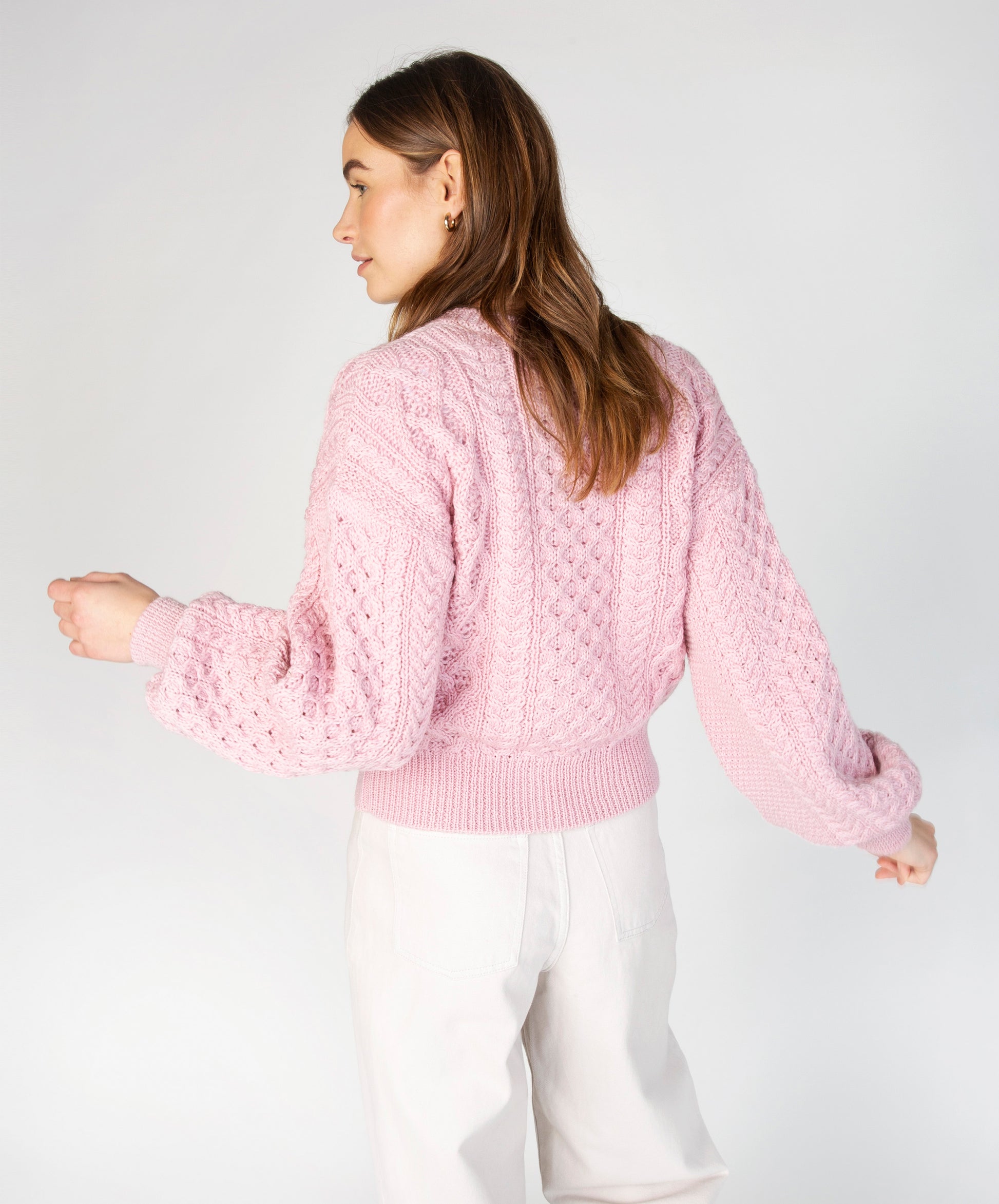 This cropped piece features relaxed lantern sleeves, a six-button front and a blend of moss, honeycomb and cable stitches that honour traditional Aran craft. Warm, breathable and thoughtfully made, it offers a contemporary expression of Irish knitwear.
