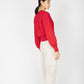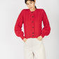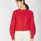 The cardigan is a bright vivid red colour that adds depth to its cropped shape. Generous lantern sleeves give the style a relaxed drape, while moss, honeycomb and cable stitches provide subtle texture inspired by traditional patterns.