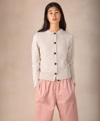 A cropped six-button cardigan blending traditional Aran style with a playful, contemporary silhouette. Designed with long slim-fitting sleeves and a high 1x1 ribbed waist for a flattering shape. Crafted from a lightweight blend of 50% recycled wool, 45% virgin wool and 5% recycled cashmere for an even softer, more luxurious hand feel. Made in Ireland and presented here in ‘Chalkstone’, a light cream with contrasting flecks.