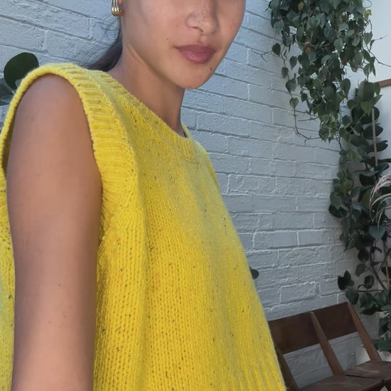 As part of the Genesis collection, the 'Luna' vest features a slightly cropped design with a contemporary oversized boxy fit. Buttercup is a vibrant bright yellow with flecks of Ink, orange and natural highlights. This is designed to be a versatile and a perfect transitional piece is designed to be worn alone or layered over a shirt, making it a perfect addition to your wardrobe. Made from a blend of 95% wool, 5% cashmere for an even softer, more luxurious hand feel.