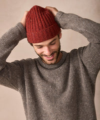 As part of our Heirlooms Collection, the 'Luxe' Ribbed stitch hat in Copper-Marl is made from a blend of 95% wool, 5% cashmere for an even softer, more luxurious feel. A solid, strong and warm deep burnt orange colour with flecks bright blue, dark brown bright orange. Guaranteed to keep you cosy against in the elements. 23 cm x 23 cm.