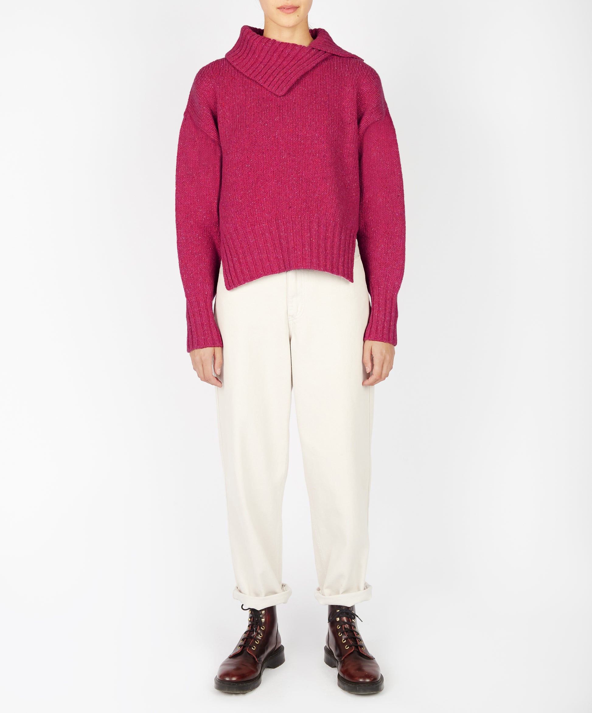 This style is designed to be generous and relaxed with a statement chunky ribbed collar. Bramble berry is a rich, vivid fuchsia pink colour speckled with mint green and purple neps. We recommend choosing your regular size as it's oversized size down for a more fitted look.